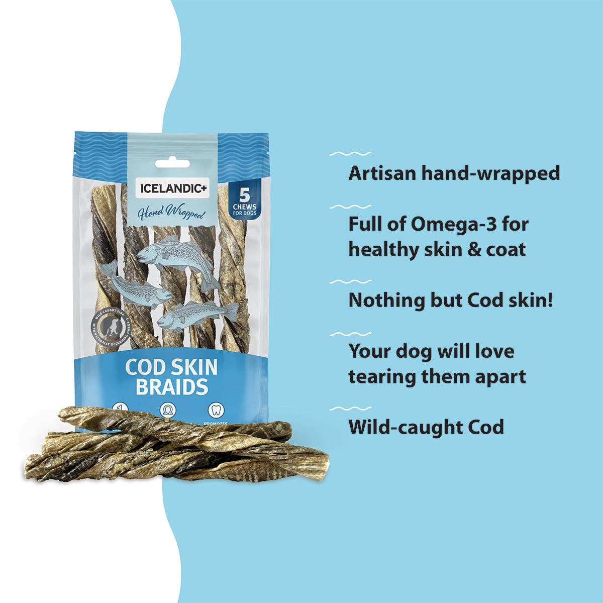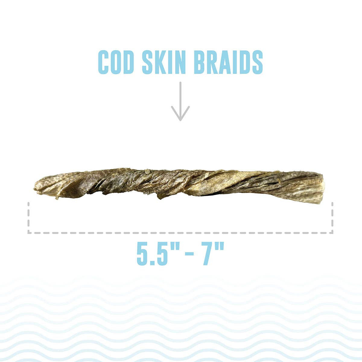 Our twisted Cod Skin Braids are made from 100% wild-caught cod hand wrapped into a chew that delivers an extra-satisfying chewing experience dogs. Perfect for chewers of all sizes and chewing styles, the unique braided texture and natural chewing action help reduce tartar and plaque buildup, promoting healthier gums and cleaner teeth.