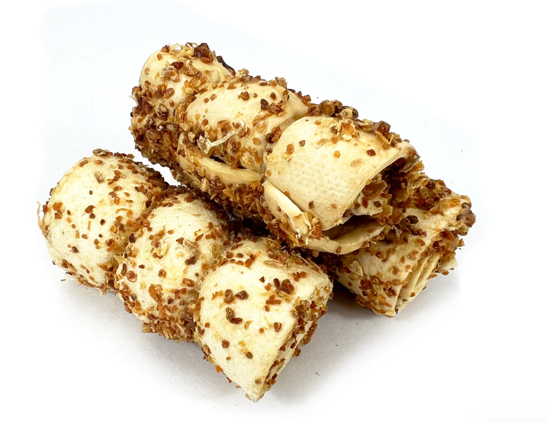 These beef cheek rolls are a good alternative to traditional rawhide bones and rolls. Beef cheeks aren't processed like traditional rawhide and still retain the different layers of the skin. Unlike a rawhide knotted bone, beef cheeks are less dense, made out of one continuous piece of beef cheek (rather than smaller scraps cooked together in a mold) and more digestible.