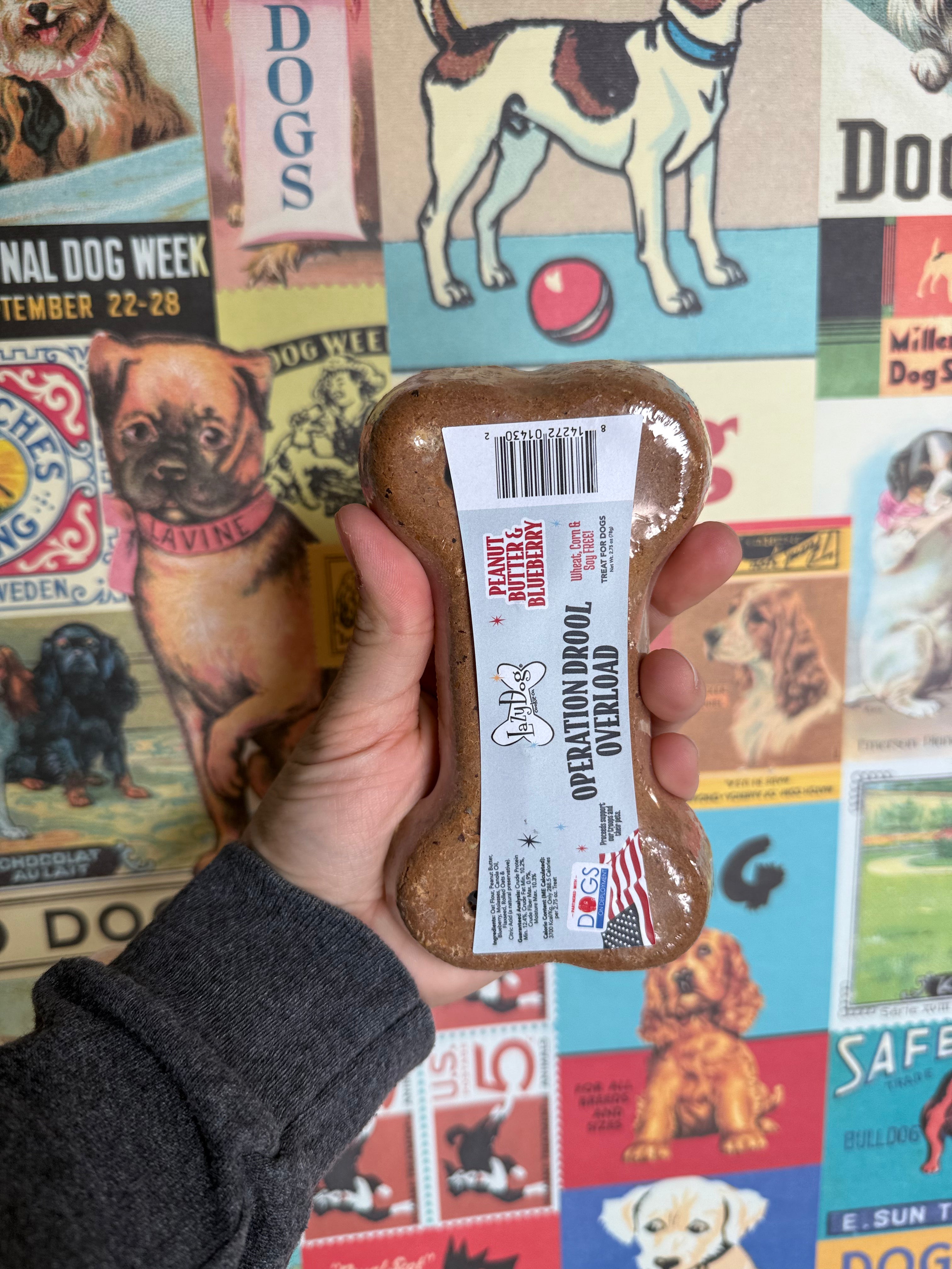 The Lazy Dog Cookie Co.® Operation Drool Overload Mega Bone—a treat that tastes good and does good! Available in drool-worthy Peanut Butter & Blueberry, these crunchy-baked bones are completely grain, wheat, and soy free, making them a wholesome snack even for pups with sensitive stomachs.